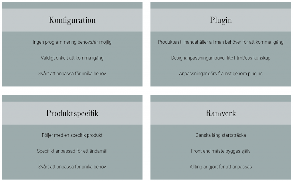 Vad vi menar med konfiguration är de lösningar där man som kund till dessa system sköter allting via ett administrationsgränssnitt och i stort sett vem som helst kan med några få enkla steg komma igång. Dessa system är väldigt bra för de som vill prova att starta en webbshop för att se om deras idé håller.